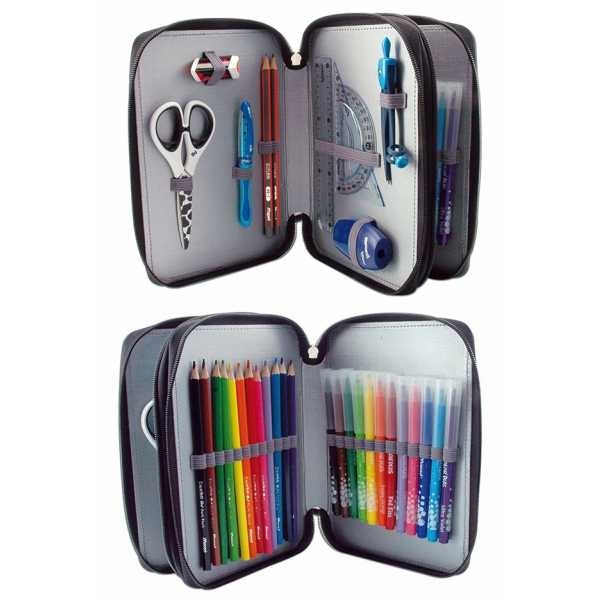 • contenu : 12 crayons triangulaires (noir, brun, vert herbe, vert pomme, jaune soleil, bleu, orange, rouge, rose, aubergine, bleu marine, bleu clair) 12 feutres (noir, brun, vert, vert clair, jaune, orange, rouge, rose, violet, bleu, bleu), 1 paire de ciseaux, 1 taille-crayon Shaker, 1 règle en plastique 150 mm, 1 équerre 60°, 1 rapporteur, 1 compas Vivo, 1 gomme Pyramide, 2 crayons HB, 1 stylo roller Freewriter Mini