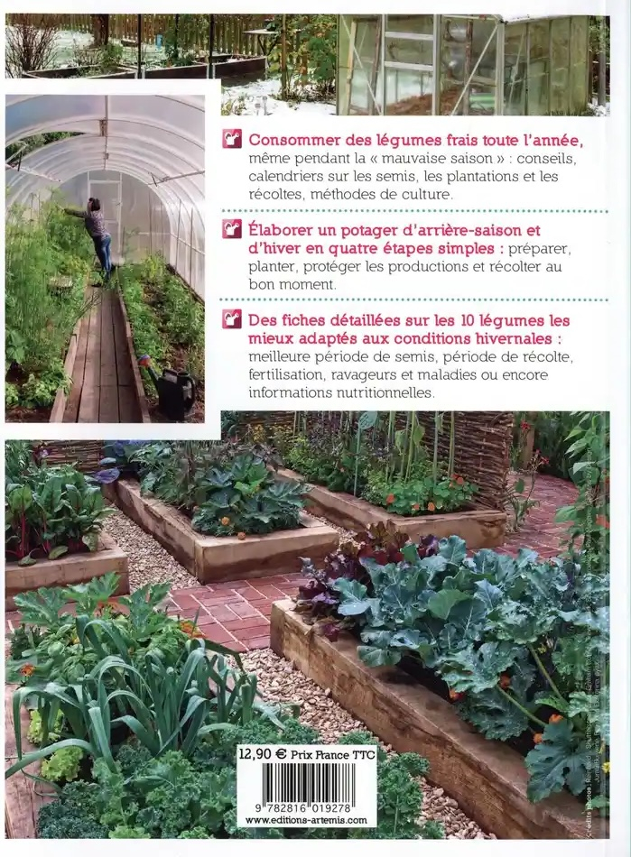 Consommer des légumes frais toute l'année, même pendant la "mauvaise saison" : conseils, calendriers sur les semis, les plantations et les récoltes, méthode de culture. Elaborer un potager d'arrière-saison et d'hiver en quatre étapes simples : préparer, planter, protéger les productions et récolter au bon moment. Des fiches détaillées sur les 10 légumes les mieux adaptés aux conditions hivernales : meilleure période de semis, période de récolte, fertilisation, ravageurs et maladies ou encore informations nutritionnelles.