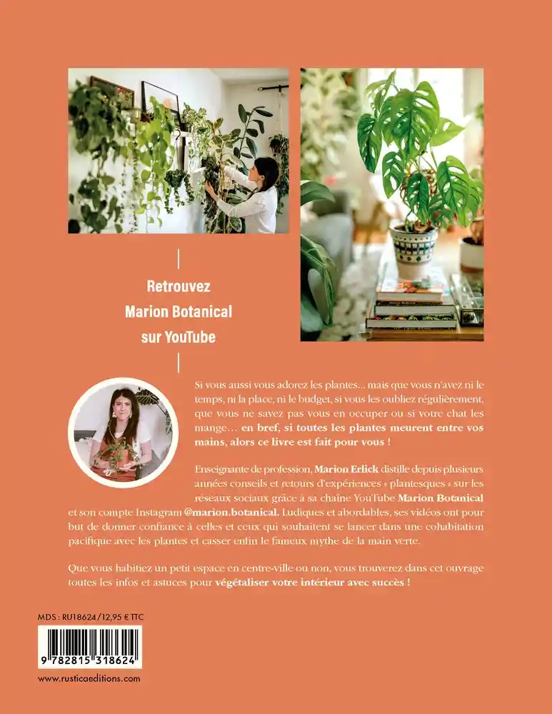 Si vous aussi vous adorez les plantes... mais que vous n'avez ni le temps, ni la place, ni le budget, si vous les oubliez régulièrement, que vous ne savez pas vous en occuper ou si votre chat les mange... en bref, si toutes les plantes meurent entre vos mains, alors ce livre est fait pour vous ! Enseignante de profession, Marion Erlick distille depuis plusieurs années conseils et retours d'expériences "plantesques" sur les réseaux sociaux grâce à sa chaîne YouTube Marion Botanical et son compte Instagram.